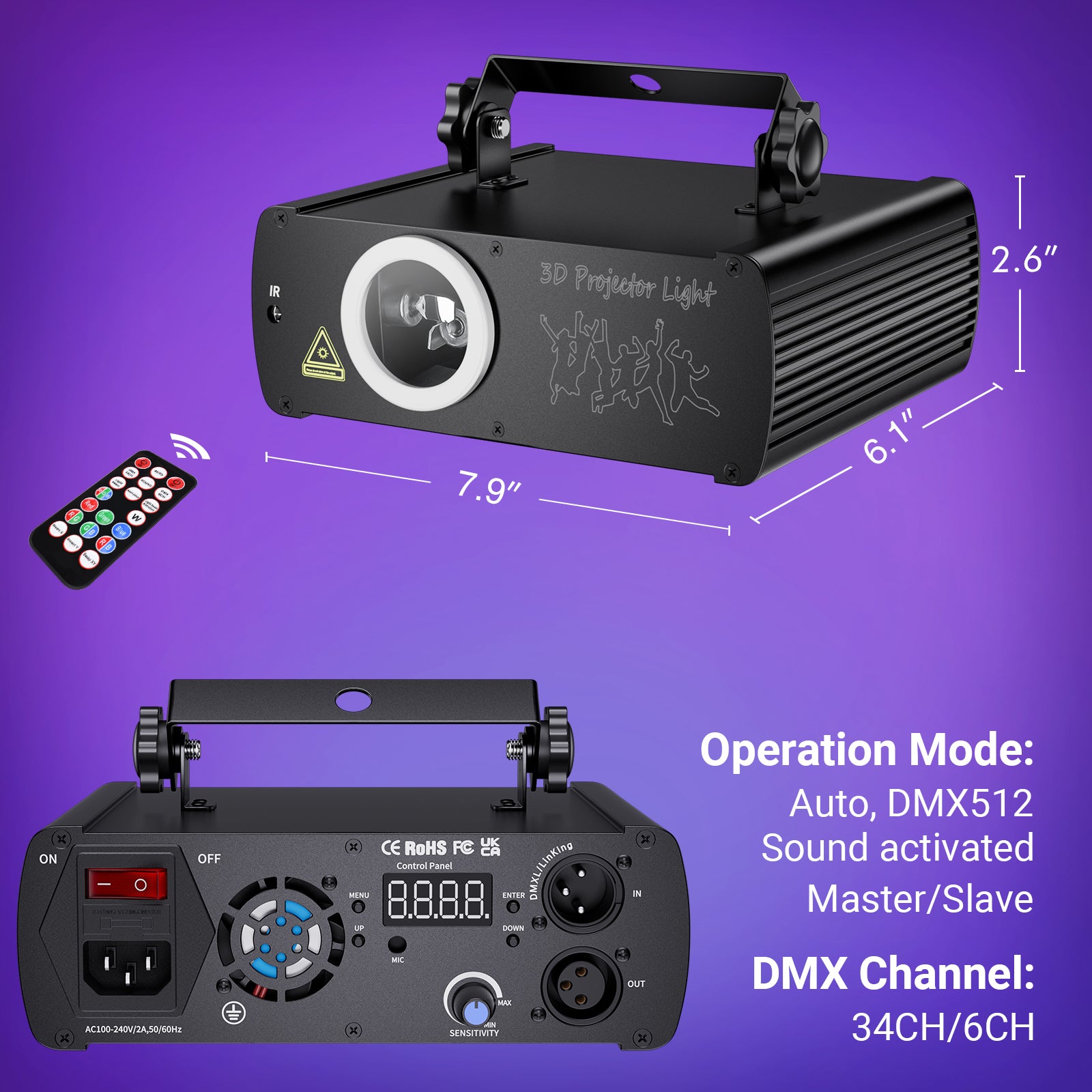 - Professional Laser Light: Animation laser with high-speed optical scanner to create 3D animated graphics, hundreds of beam and graphics show patterns. rotating, movement, zoom, drawing and speed, etc, and with the function of color change.